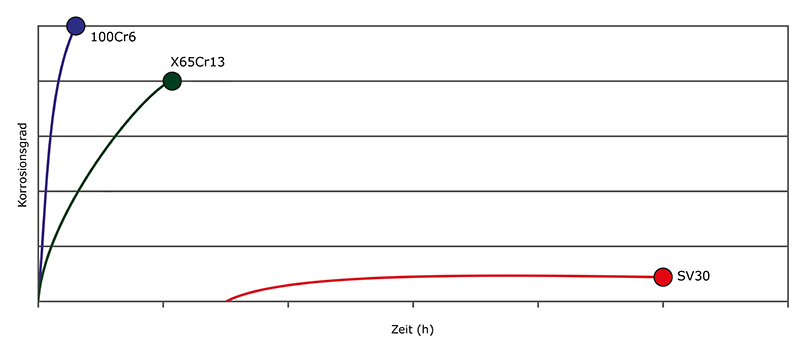 Die nachfolgende Abbildung zeigt den Korrosionsgrad in Abhängigkeit von der Zeit des Hochleistungsmaterials SV30 (30X) im Vergleich zu den herkömmlichen Wälzlagerstählen 100Cr6, 9Cr18 und X65Cr13.